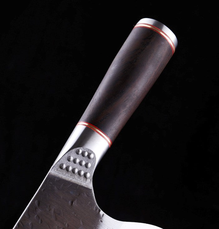 Name: High chromium steel kitchen knife/chef's knife/meat and bone cutting knife Size: As shown in the above figure Material: 5CR15MOV silver vanadium steel Knife handle: ebony wood